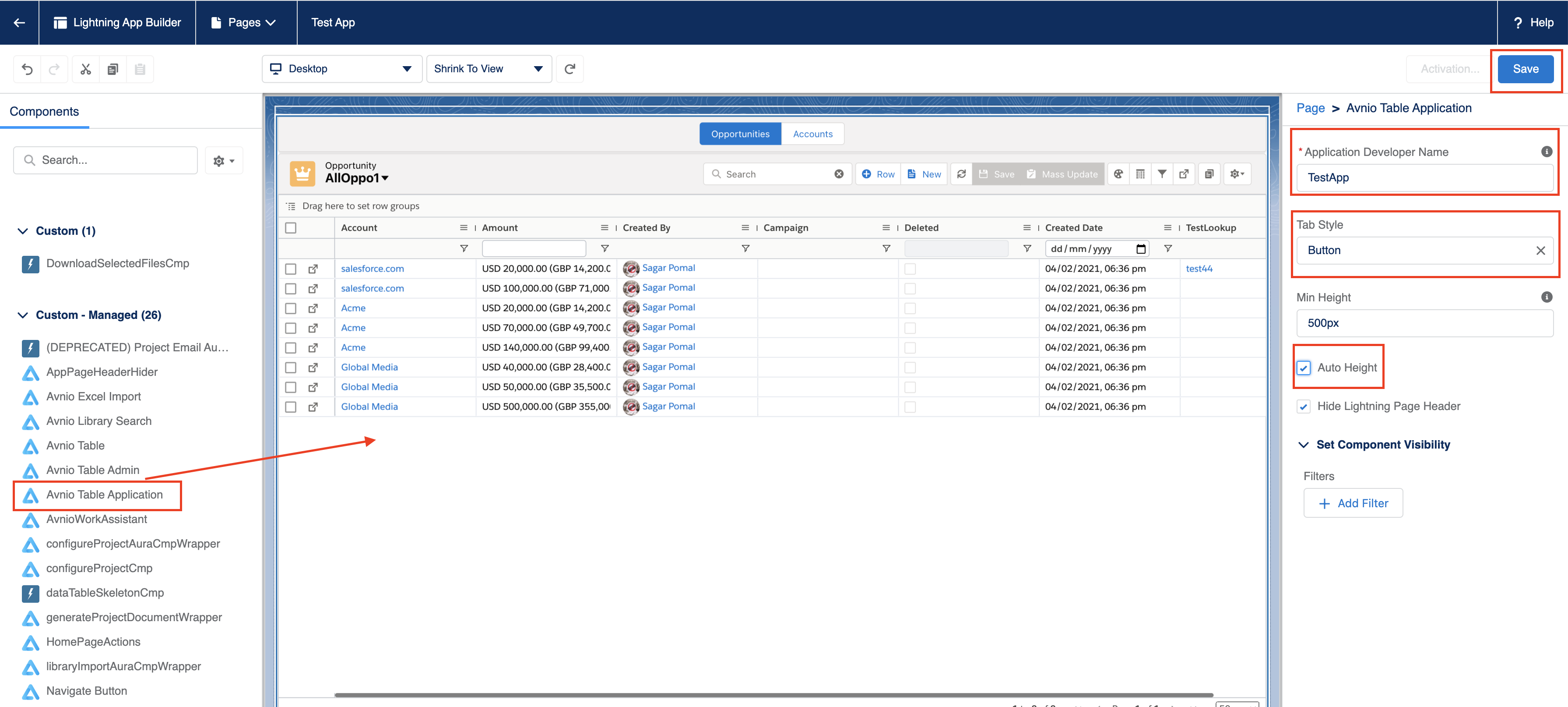Now drag Avnio Table Application from the left panel of the Lightning App Builder page and drop-in centre