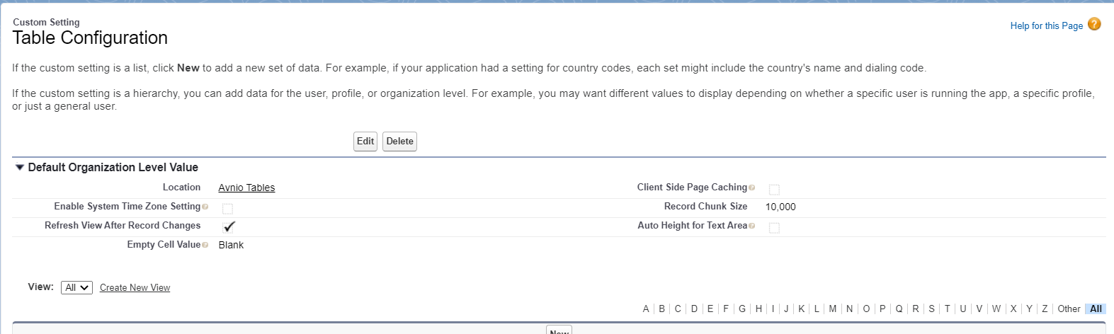 Record Chunk Size: As mentioned above, Avnio Tables has to work with larger data, due to salesforce limitation on heap size, we can query or fetch certain numbers of records only depends on columns. So if we need to work with more columns(i.e. more than 20), we need to reduce chunk size to accommodate heap size issue. Default Value of chunk is 10,000 but can be decreased if there is significant increase in columns numbers to work with any of Object’s View.