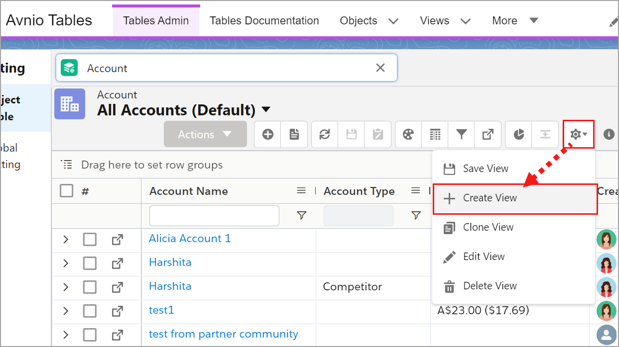 You will be navigated to the object list view drop-down page.Hover on the Setting (Gear icon) and select the Create View button.