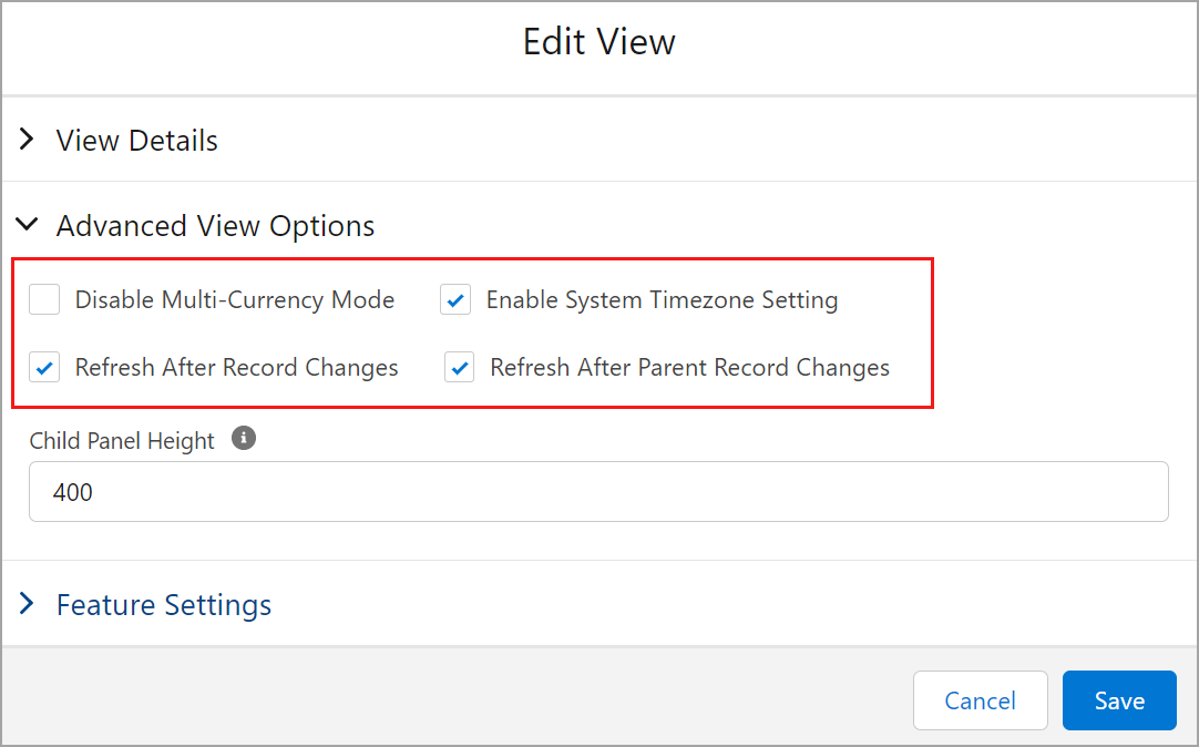 The height of a child panel refers to the vertical space allocated to display related records in a parent-child relationship. You can adjust the default height of the Child Panel by editing the Child Panel Height field in the Table View.
