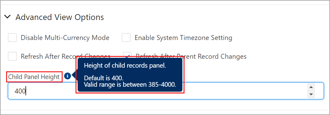 The default value provided in this field is 400. You can adjust the height range from 385 to 4000 by entering the value or clicking the up or down arrow, which will change the height of the Child Panel.Click the Save button.
