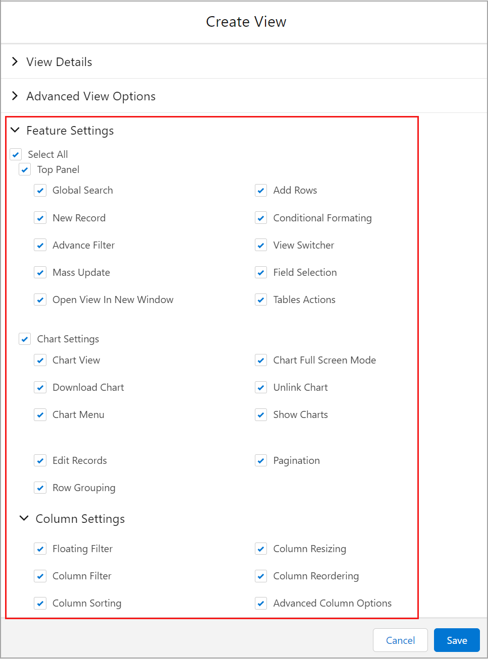 You can turn ON or OFF view features based on your requirements, which will allow or prevent you from accessing specific features in the View. By default, the Select All checkbox is already checked to allow all the features to be enabled when creating or editing a View on an object.