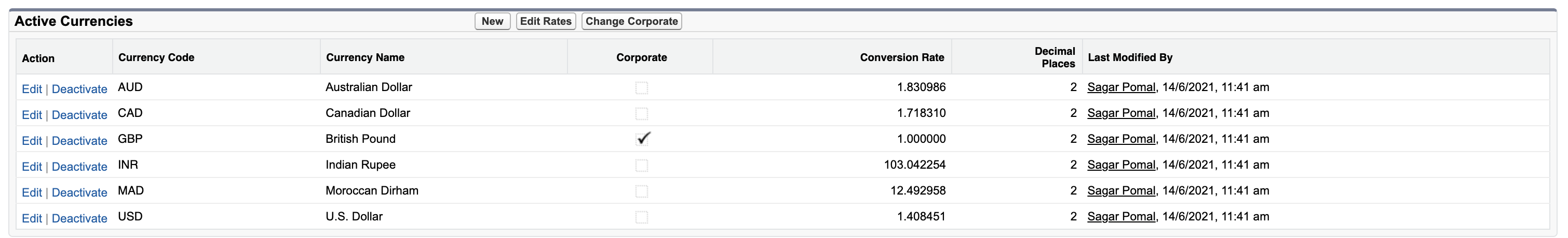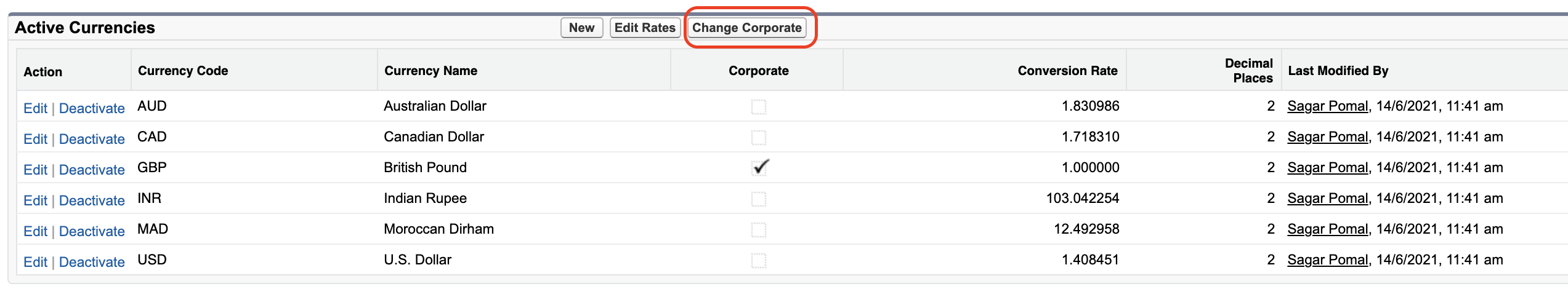 In the Active Currencies list, click Change Corporate.