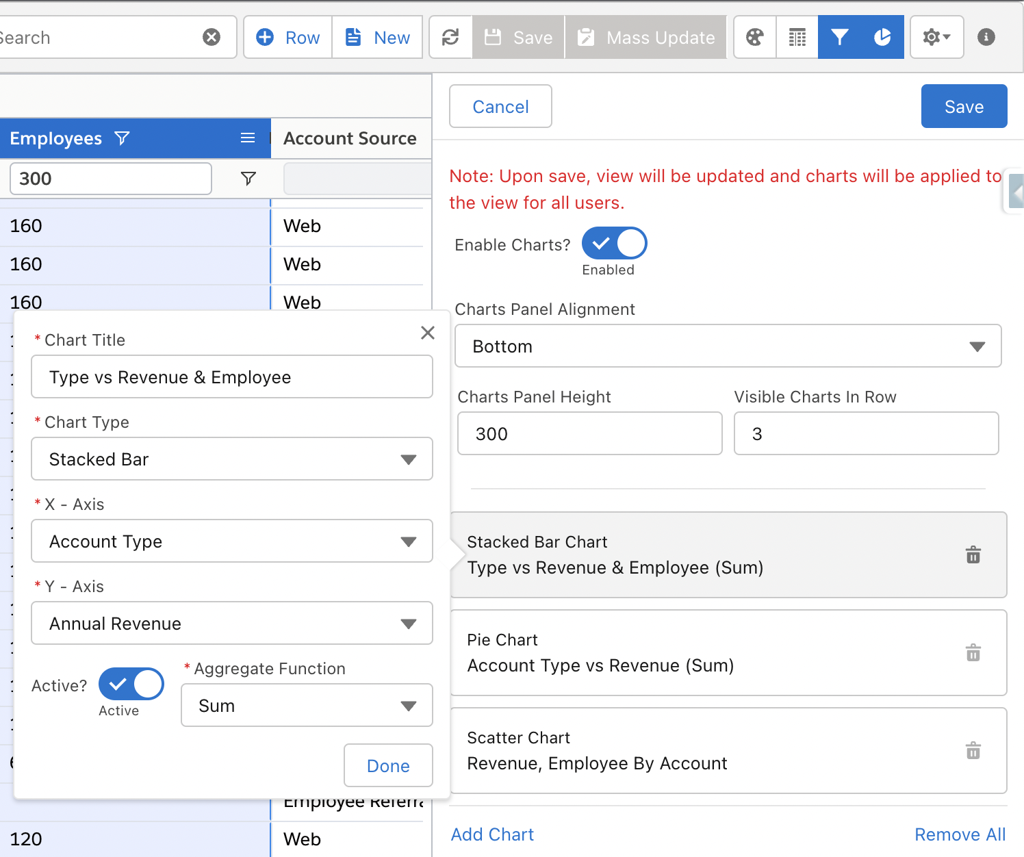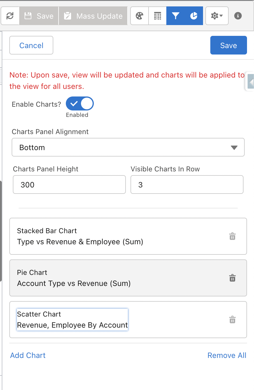 Visible Charts in Row: Specify how many charts can be seen at time. For small device system will show only one chart due to space constraints. For larger screen this can be set any numbers. For example, if value is 3 and total 4 charts added then system will show 3 charts in current view while remaining chart can be seen after scrolling horizontally.