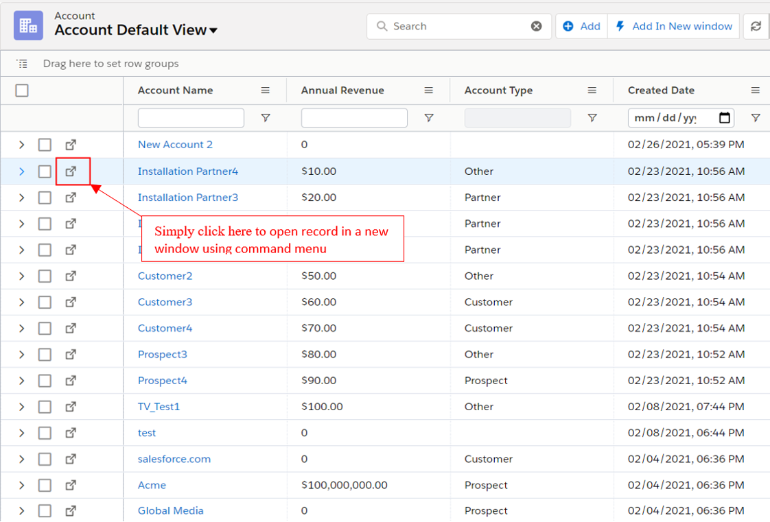 Open record in a new window using the command menu.