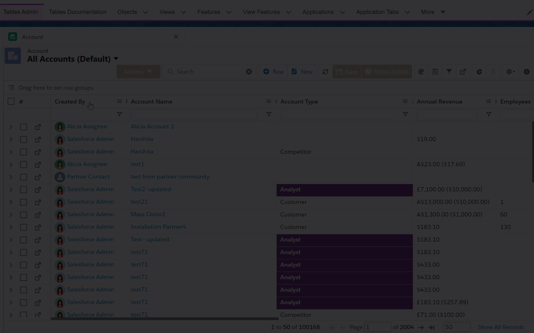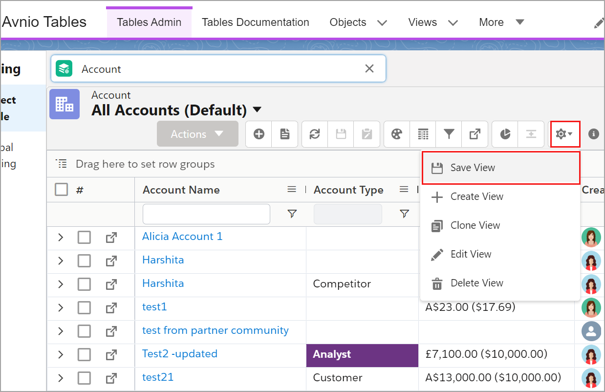 You can save a View that includes all modifications made to that specific Table View, such as sorting, grouping, filtering, pagination size, column sizing, and ordering made to the current page. All of your saved Views are listed in the object page's View drop-down list.