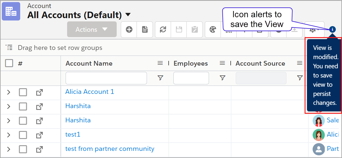 Info Icon: When you made necessary changes to the view, this icon will appear and prompt you to save the View. All unsaved changes will be lost if you refresh the page or navigate to another view before saving.